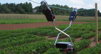 ‘Tarzan’ the robot saves energy by swinging. Someday, it could help with farm work by moving along wires strung across fields of crops.