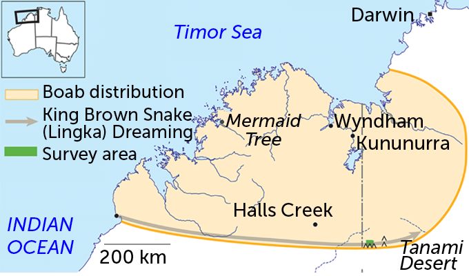 Boab trees grow in the northwestern corner of Australia. A survey (green rectangle) near the edge of the Tanami Desert revealed a patch of boab trees carved with dendroglyphs. The carvings tie the region to the path of the Lingka Dreaming (gray arrow). This trail connects cultural sites across hundreds of kilometers.