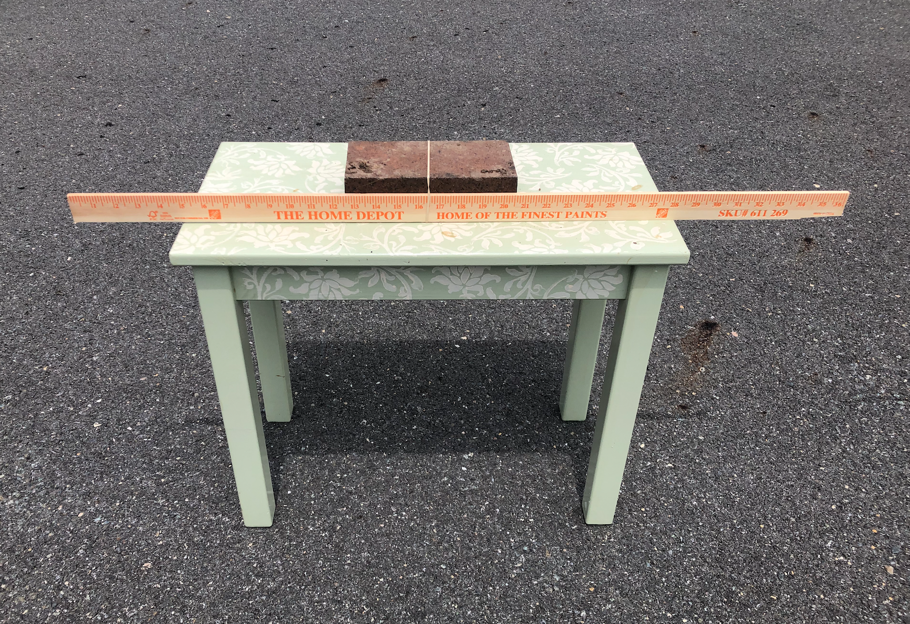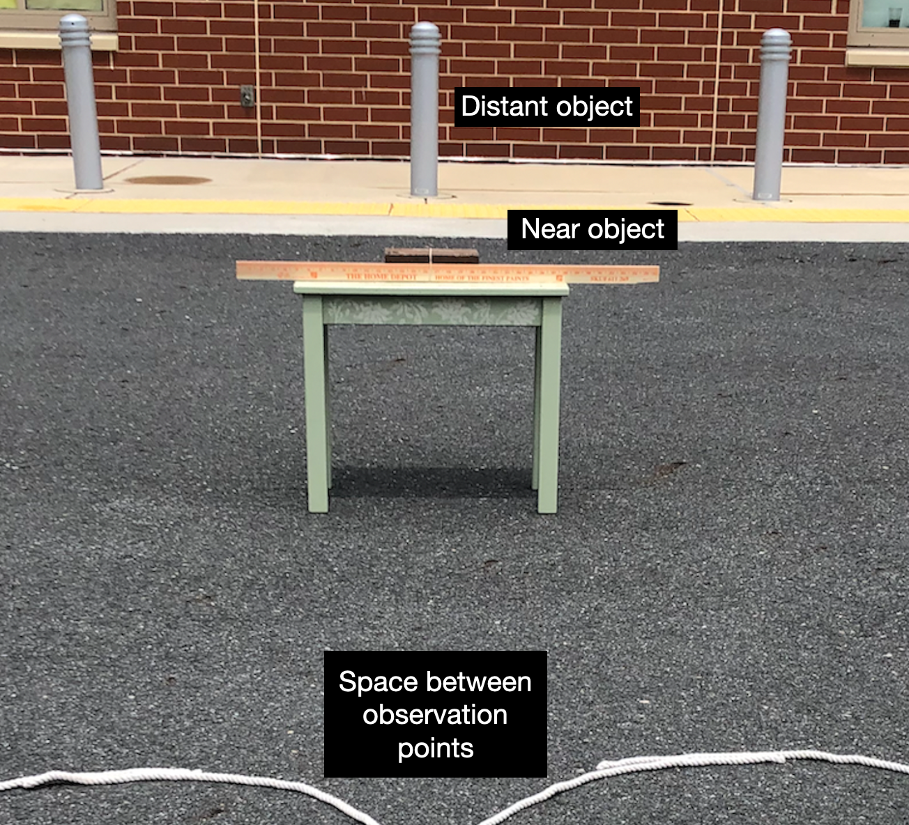 10. Now move the table (with the rock and meterstick still on it) 2 meters (6.6 feet) closer to the distant object. Make sure the meterstick markings are still facing the hula hoops/rope loops. Use your measuring tape to measure the distance between the table and the closer edge of the hula hoops/rope loops (it should be 4 meters, or 13 feet).