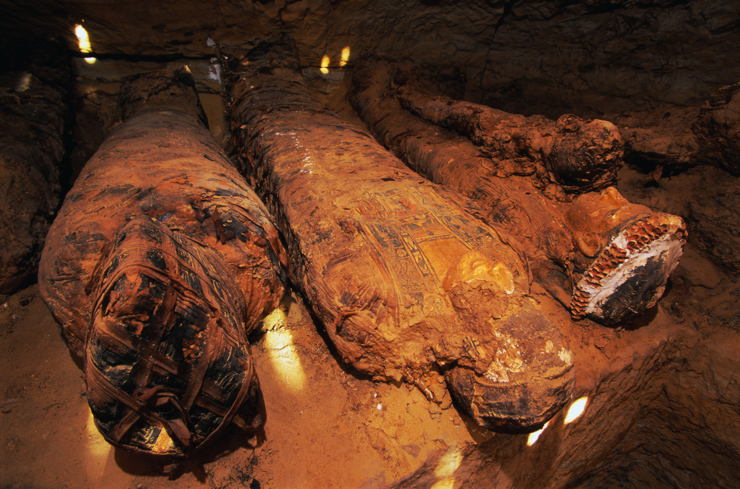 Once the body was completely desiccated, it was rubbed with perfumed oils and then wrapped very carefully with linen bandages. Once completely wrapped, the remains were placed inside of a sarcophagus and then inside of a tomb. In the case of the pharaohs Khufu, Khafre and Menkaure, their tombs are now known as the Great Pyramids of Giza.